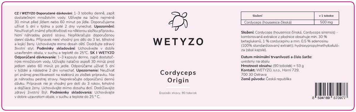 Proto u WETYZO Cordyceps Origin vždy najdete jasnou standardizaci: extrakt z plodnice obsahuje obsahuje min. 30 % 1,3/1,6- beta-glukanů, min. 1 % cordycepinu a min. 0,5 % adenosinu (100% standardizovaný extrakt; hodnoty ověřené laboratorními testy a doložené certifikáty).